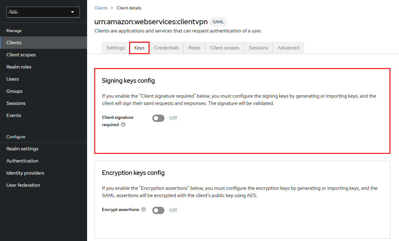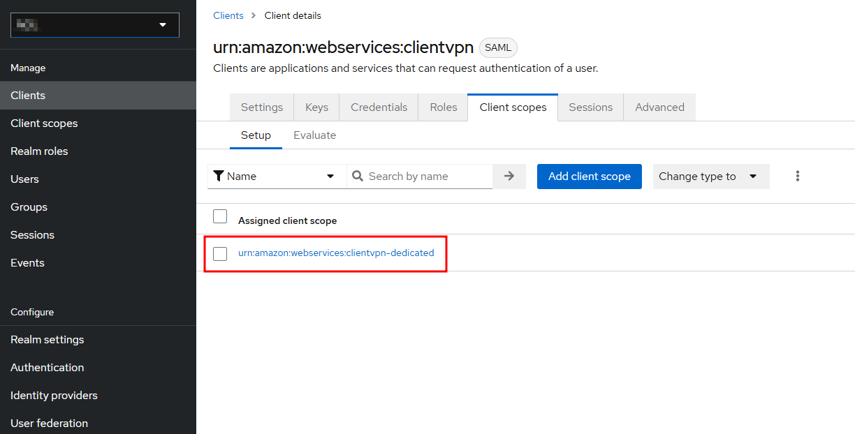 Client scopes 탭에서 urn:amazon:webservices:clientvpn-dedicated의 scope 탭에 들어간다.