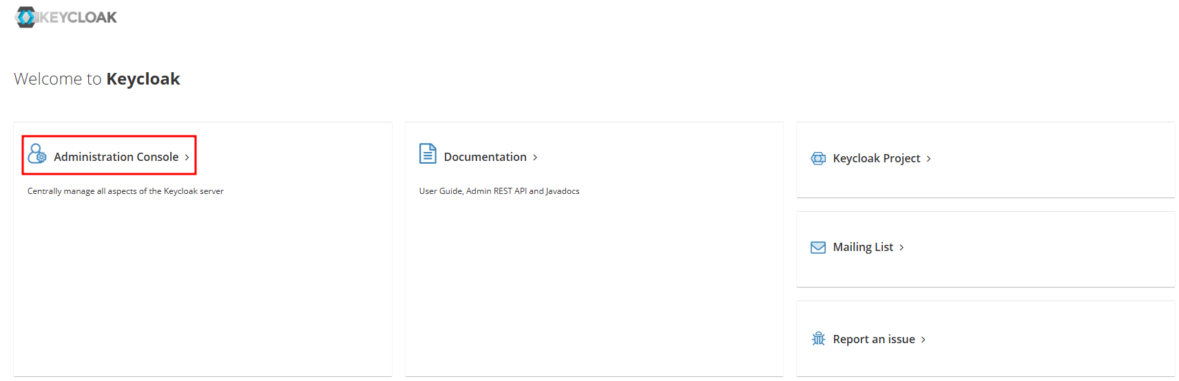 Keycloak 페이지에서 Administration Console을 눌러 관리자 페이지에 접근한다.