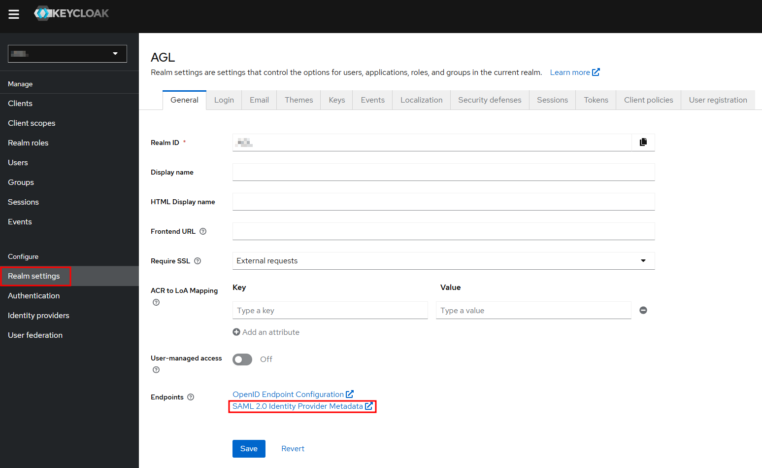 왼쪽의 Realm settings에서 SAML 2.0 Identity Provider Metadata를 누른 뒤 ctrl+s를 눌러 SAML 파일을 다운 받는다.