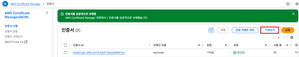 AWS ACM에서 생성된 인증서를 업로드 해준다.