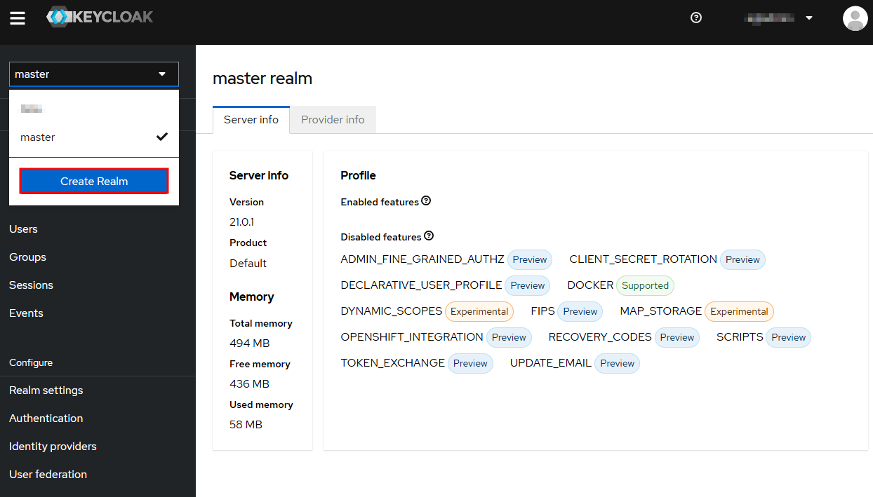 왼쪽 위의 Create Realm 버튼을 눌러 Realm을 생성 해 준다. Realm name만 입력해주면 된다.