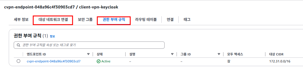 이때 권한 부여 규칙은 클라이언트 VPN 사용자가 접근 가능한 VPC 대역이다.