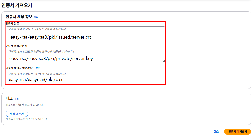 서버에서 Client VPN에 사용할 인증서를 만들어준다.(해당 내용은 포스팅 된 글이 많기에 자세한 설명은 생략한다.)