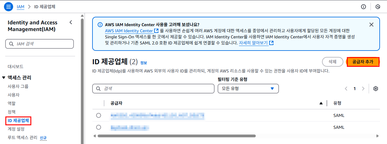 AWS에서 Identity and Access Management(IAM)를 들어가 ID제공업체에서 공급자 추가를 눌러준다.